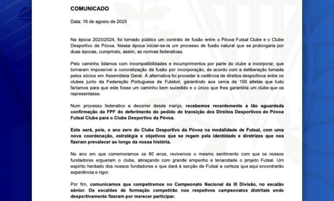 Num processo federativo a decorrer desde março, recebemos recentemente a tão aguardada confirmação da FPF do deferimento do pedido de transição dos Direitos Desportivos do Póvoa Futsal Clube para o Clube Desportivo da Póvoa.