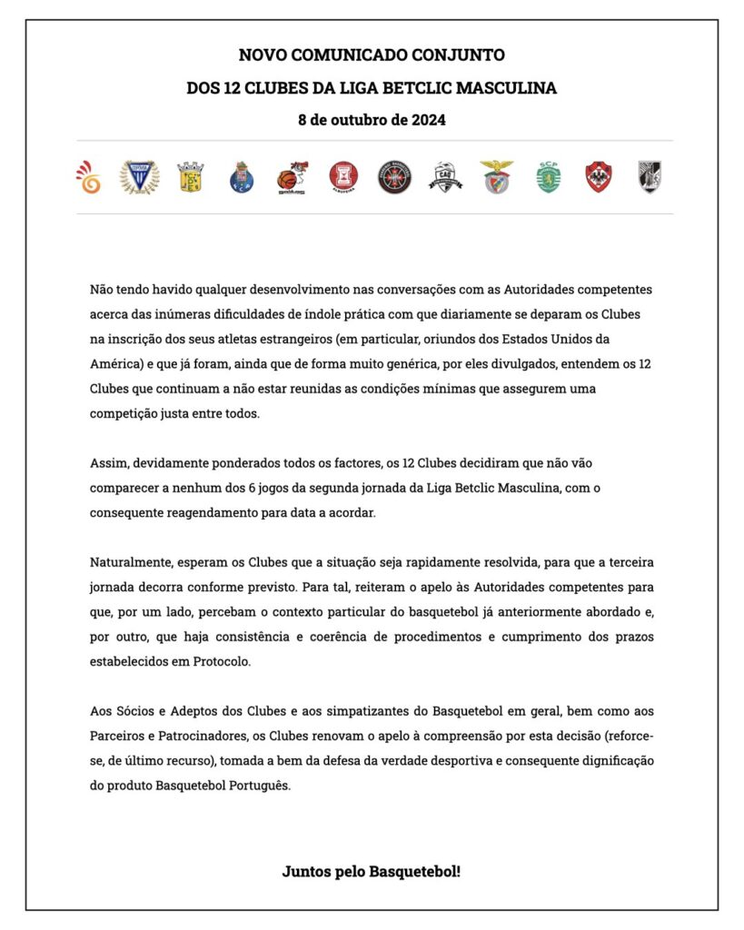 Aos Sócios e Adeptos dos Clubes e aos simpatizantes do Basquetebol em geral, bem como aos Parceiros e Patrocinadores, os Clubes renovam o apelo à compreensão por esta decisão (reforce-se, de último recurso), tomada a bem da defesa da verdade desportiva e consequente dignificação do produto Basquetebol Português.